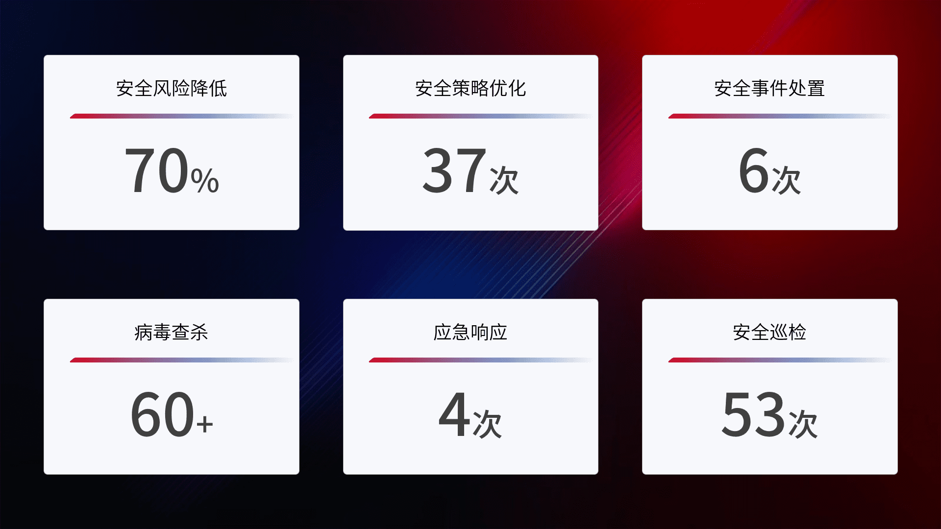 提供全面的安全事件报告体系,,,包括处置报告、、周报、、季度和年度总结,,,结合持续监控,,,帮助客户深入了解网络安全状况。。。。