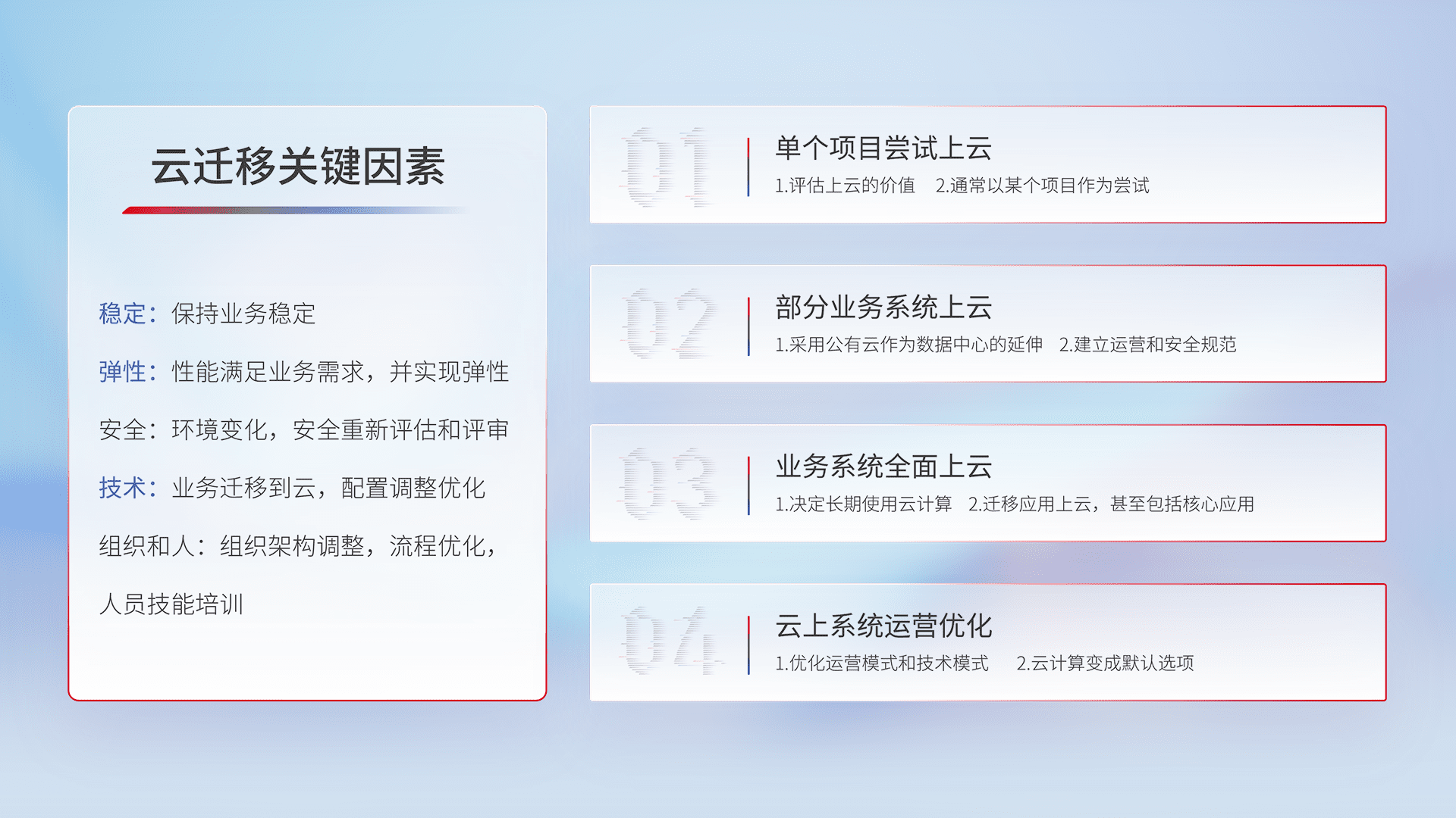 结合实际业务,,,,从规划设计、、、、云平台选型、、、、云原生改造、、数据迁移、、、、集成交付,,,迁移全过程为客户识别最佳上云路径,,,做好风险识别管理,,设计网络架构、、、、身份权限、、、、安全审计合规、、操作审计、、日志审计、、、监控告警策略、、、多站点容灾设计等,,对云上基础设施进行整体规划,,,,提升IT治理水平,,,以满足弹性、、高可用、、、高性能的需求。。。