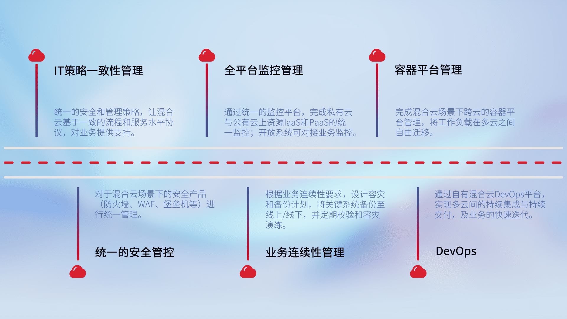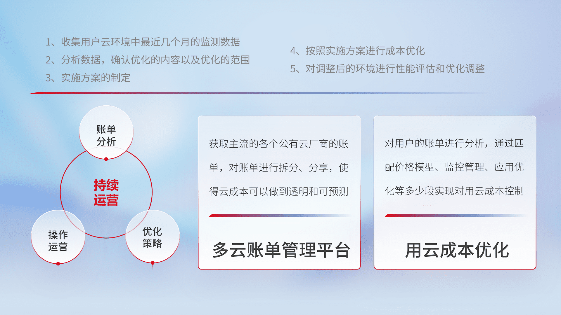 通过多云纳管,,以统一的资源数据模型把客户的云资源进行抽象和封装,,,进而实现对多云资源的统一操作,,,保障云资源管理的可靠性、、、稳定性与可用性。。量身定制化运维内容,,,,配置、、开发运维、、、、补丁管理、、、备份、、监控、、、、认证和访问管理、、审计和日常巡检等,,,保障在用云过程中的可靠度,,稳定度以及高可用率。。