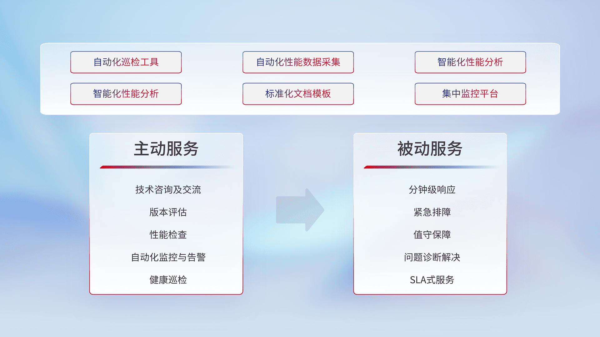 智能化工具和标准化文档,,,,保障服务质量,,,提供主动服务(包含技术咨询、、、、版本评估、、、、性能检查、、、、自动化监控与告警、、健康巡检)和被动服务包含(分钟级响应、、、紧急排障、、值守保障、、、问题诊断解决、、、SLA服务)。。。